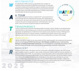 The need for our pursuit teams to think outside-of-thebox and bring unique strategies/attributes to the pursuit process is important, as well as unique ways to market these in proposals—that’s why, in our WATER2025 proposal, we created a unique “stamp” tailored to the project that was centered around being a good, reliable partner and proposing our “A-Team.” We used this stamp throughout the proposal that correlated with the project goals that our team then provided specific solutions on, while aligning our goals with the City’s project goals.